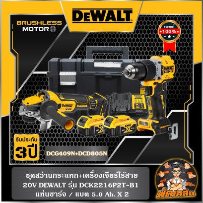 ชุดคอมโบ สว่านกระแทกและเครื่องเจียรไร้สาย Dewalt 20V แบต 5.0 Ah 2 ก้อน (DCK2216P2T-B1)