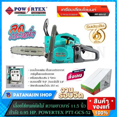 เลื่อยโซ่ยนต์ตัดไม้ ความยาวบาร์ 11.5 นิ้ว กำลัง 0.95 HP. POWERTEX PTT-GCS-52