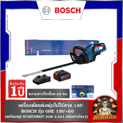 เครื่องตัดแต่งพุ่มไม้ไร้สาย 18V BOSCH รุ่น GHE 18V-60+Starter Kit BA18V 4.0Ah +GAL18V-40 (แบต 4.0 = 1 ก้อน แท่นชาร์จ = 1 อัน)