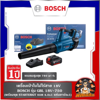 เครื่องเป่าใบไม้ไร้สาย 18V BOSCH รุ่น GBL 18V-750+Starter Kit BA18V 4.0Ah +GAL18V-40 (แบต 4.0 = 1 ก้อน แท่นชาร์จ = 1 อัน)