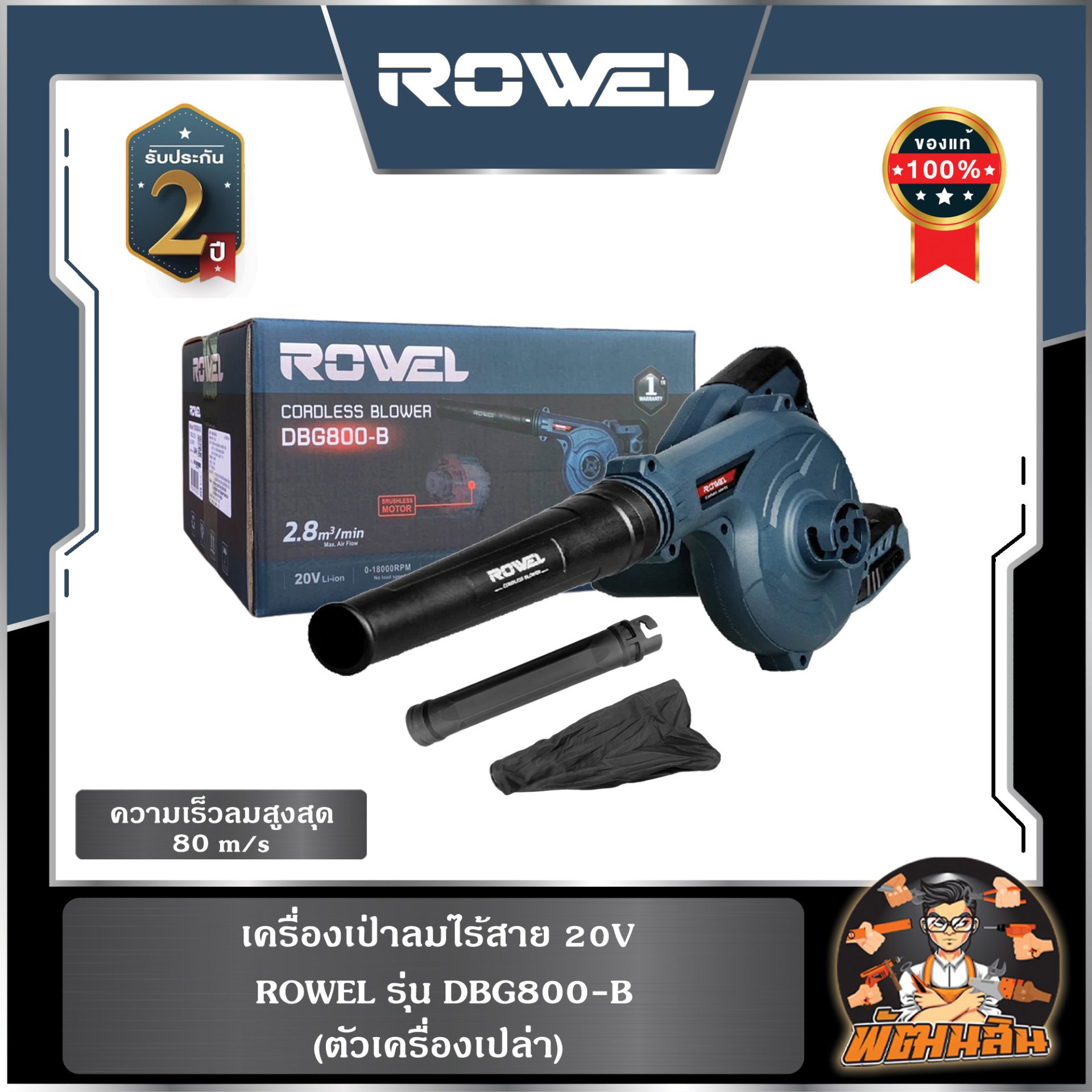 (ตัวเปล่า) เครื่องเป่าลมไร้สาย 20V DBG800-B ROWEL