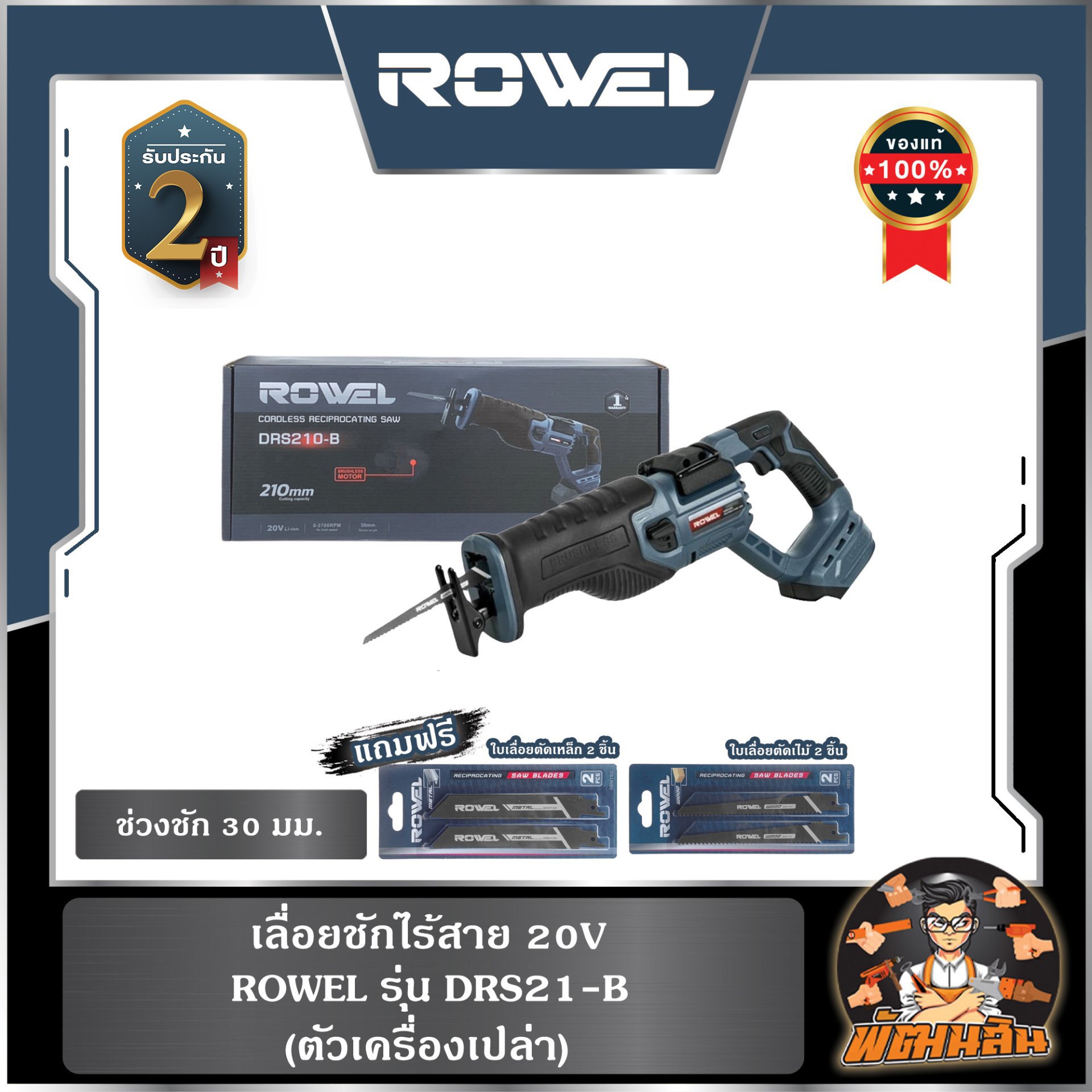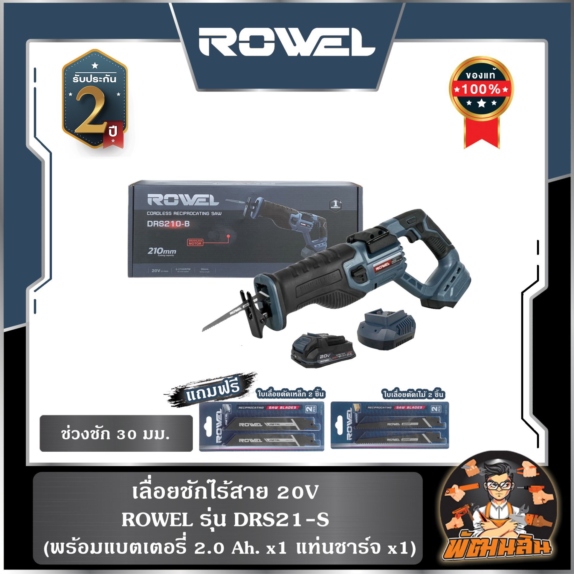 เลื่อยชักไร้สาย 20V ROWEL DRS21-B/S (แบต 2.0Ahx1 ก้อน) , ตัวเปล่า DRS21-B