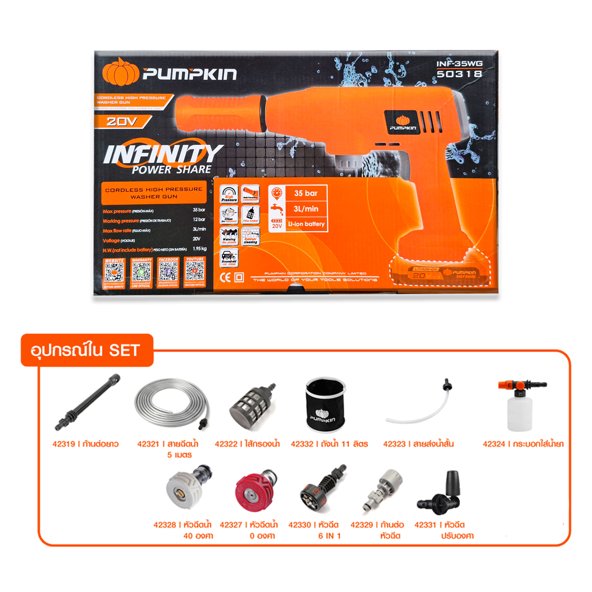 (เครื่องเปล่า) ปืนฉีดน้ำแรงดันสูงไร้สาย 20V 35 บาร์ INF-35WG PUMPKIN (50318)