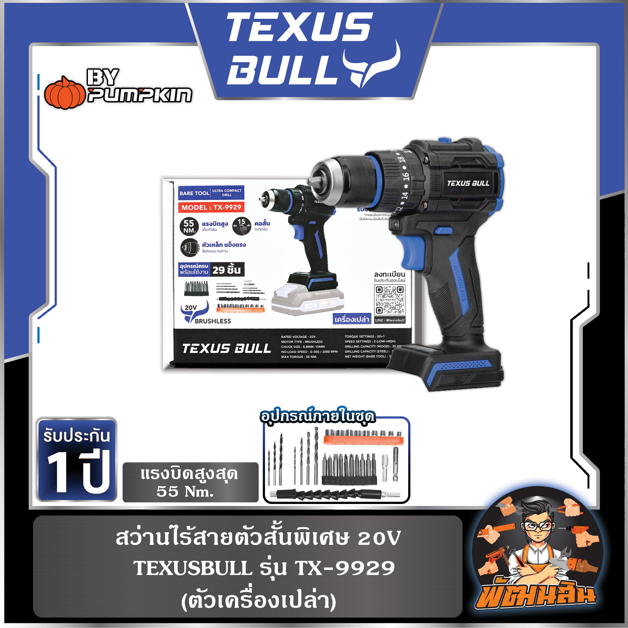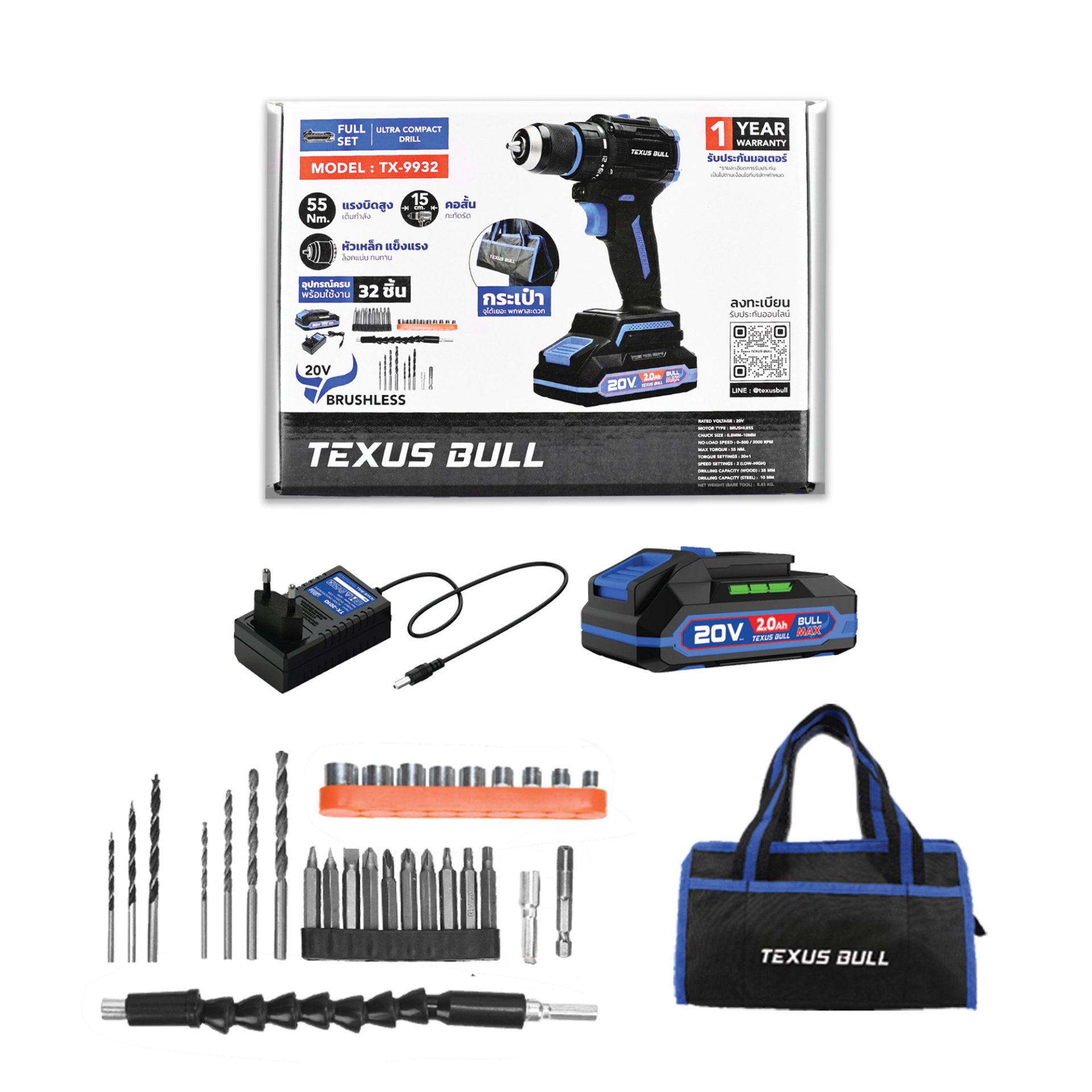 สว่านไร้สาย 20V พร้อมอุปกรณ์ 32 ชิ้น TEXUS BULL รุ่น TX-9932 (แบต 2.0Ah x 1) , ตัวเปล่า รุ่น TX-9929 (29 ชิ้น)