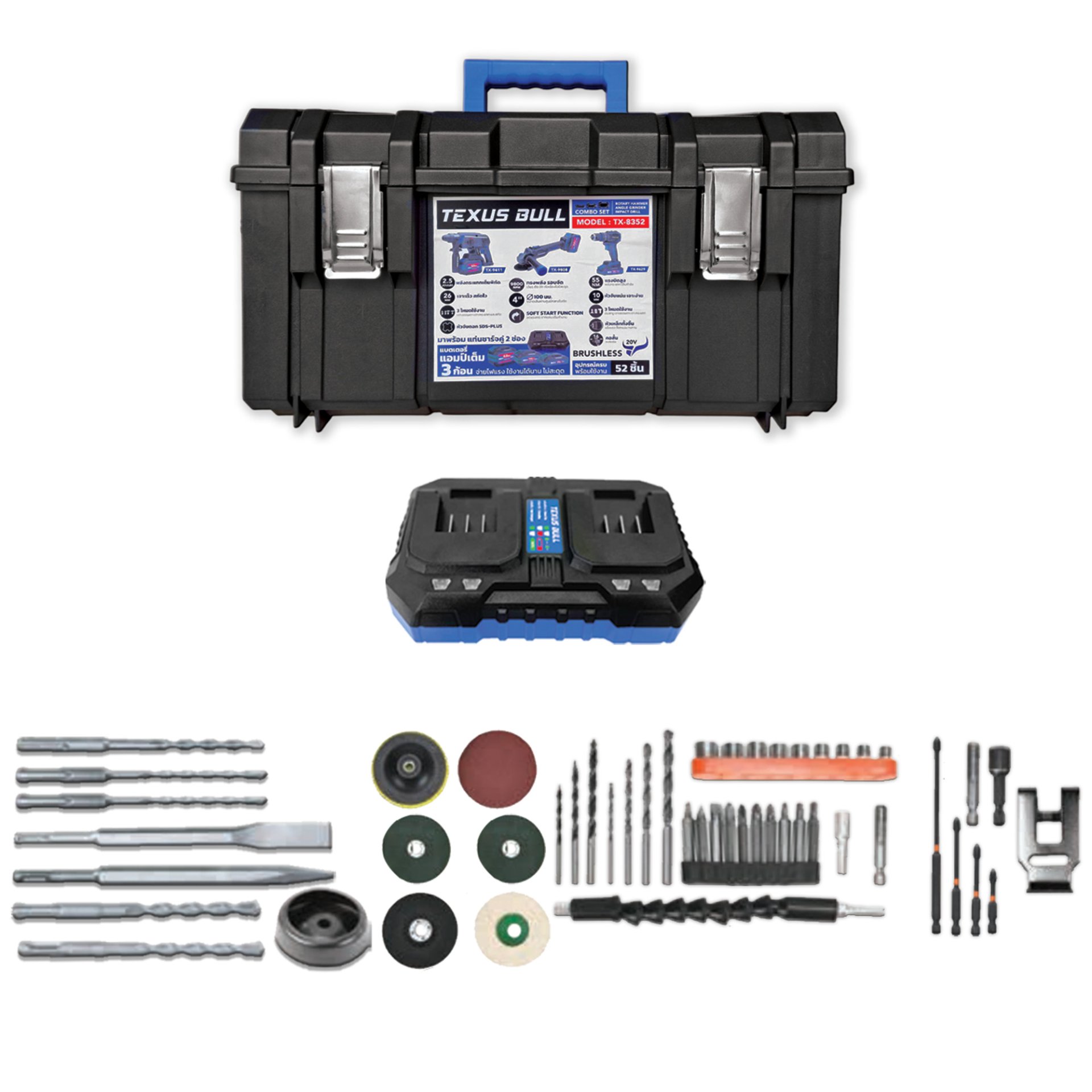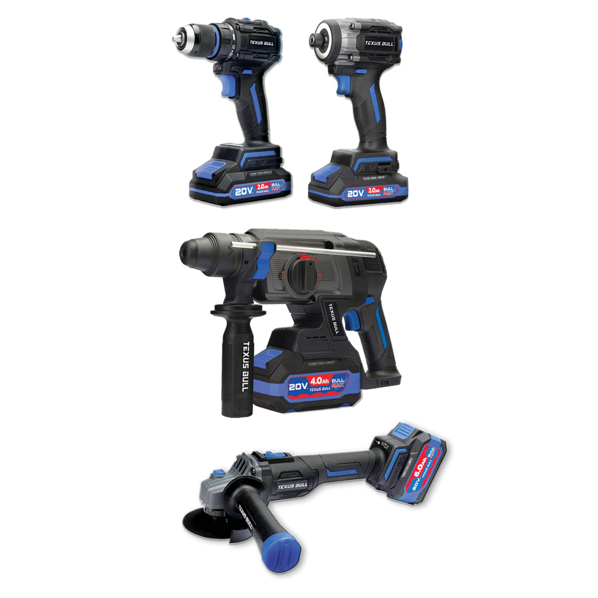 ชุดสว่านโรตารี่+สว่านกระแทก+ไขควงกระแทก+เครื่องเจียรไร้สาย 20V TEXUS BULL รุ่น TX-8457 (แบต 2.0Ah+2.0Ah+4.0Ah+6.0Ah)