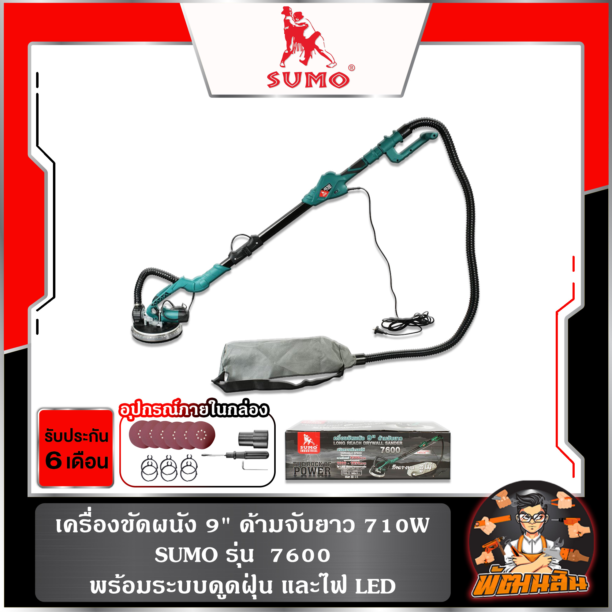 เครื่องขัดผนัง 9" ด้ามจับยาว รุ่น 7600 SUMO มาพร้อมระบบดูดฝุ่น และไฟ LED
