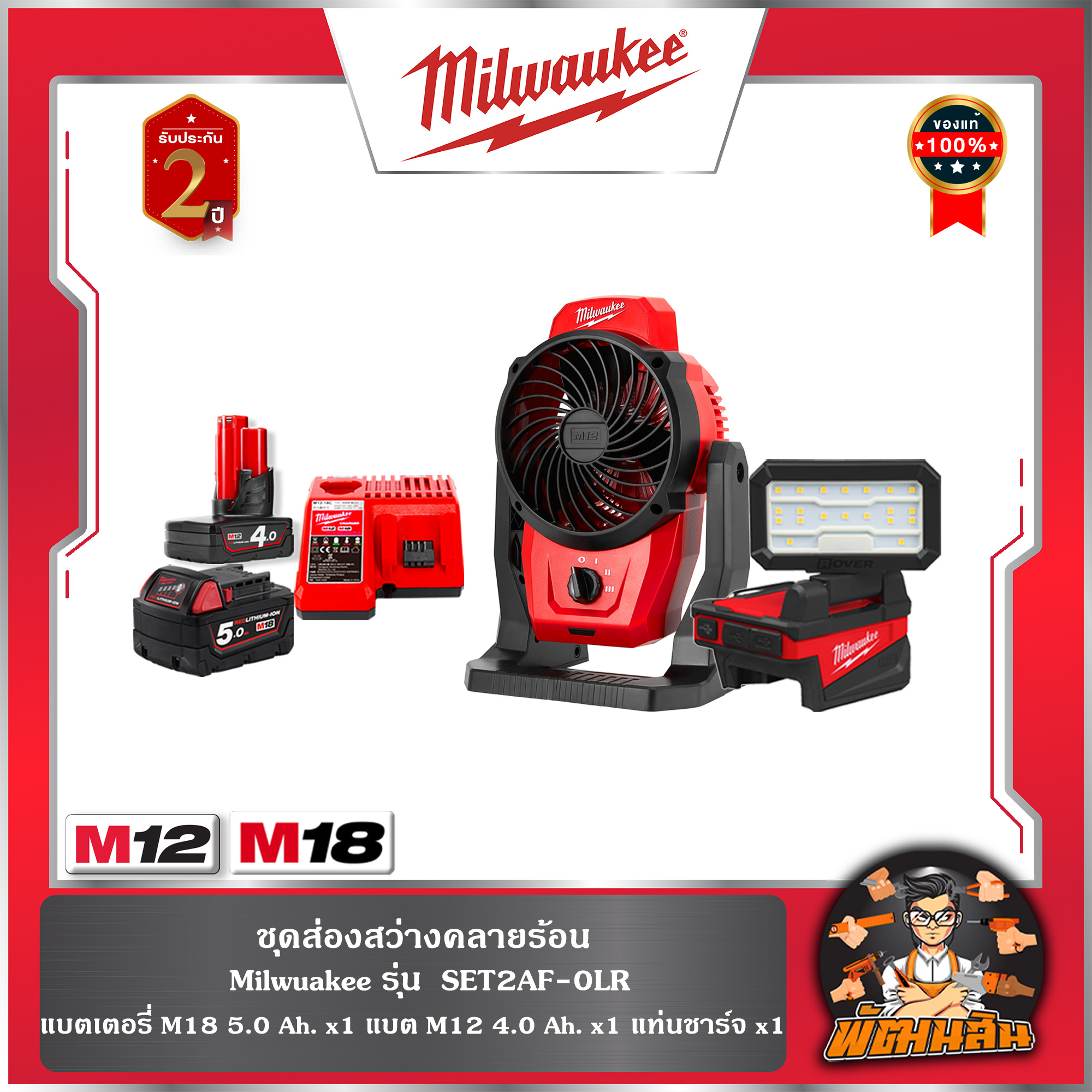รายละเอียดสินค้า1X I M12 พัดลมไร้สาย 12 โวลต์1X I M18 ไฟส่องทำงานแบบพกพา1X I M12 แบตเตอรี่ 4.0 แอมป์อาว1X I M18 แบตเตอรี่ 5.0 แอมป์อาว1X I M12-18 แท่นชาร์จแบตเตอรี่ ✅ รับประกันสินค้า 2 ปี