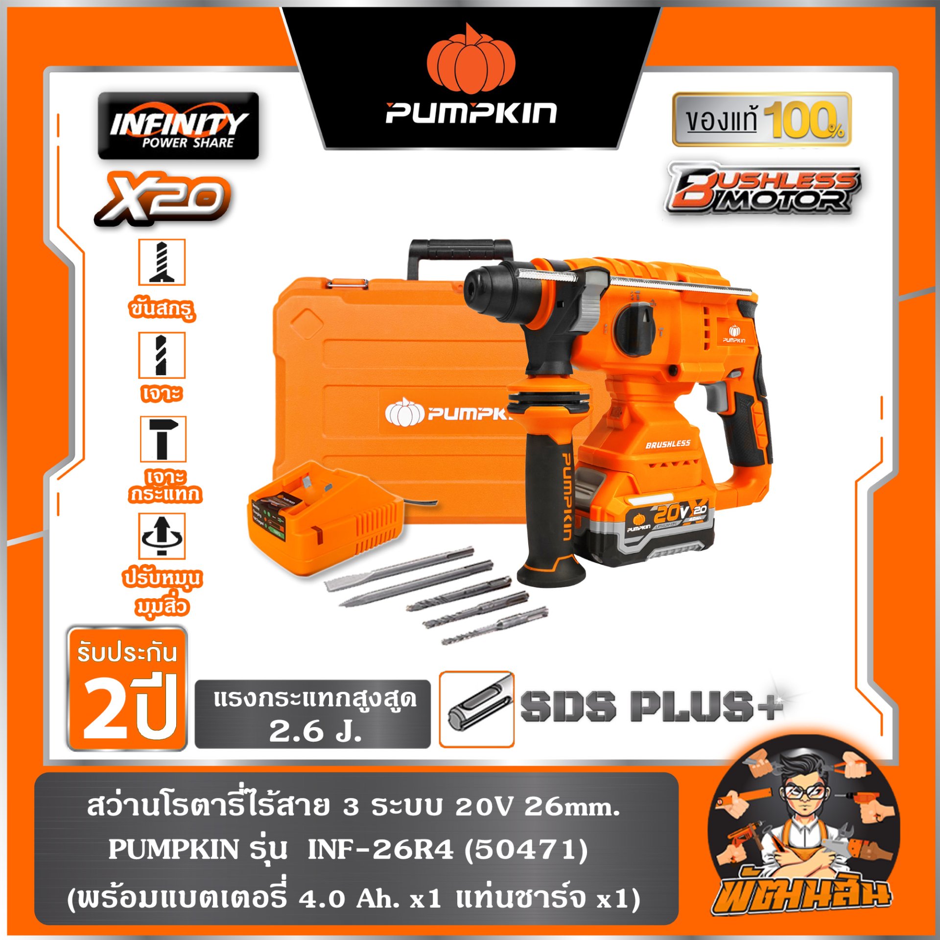 สว่านโรตารี่ไร้สาย 3 ระบบ 20V 26mm. PUMPKIN รุ่น INF-26R4 (50471) (พร้อมแบตเตอรี่ 4.0 Ah. x1 แท่นชาร์จ x1)