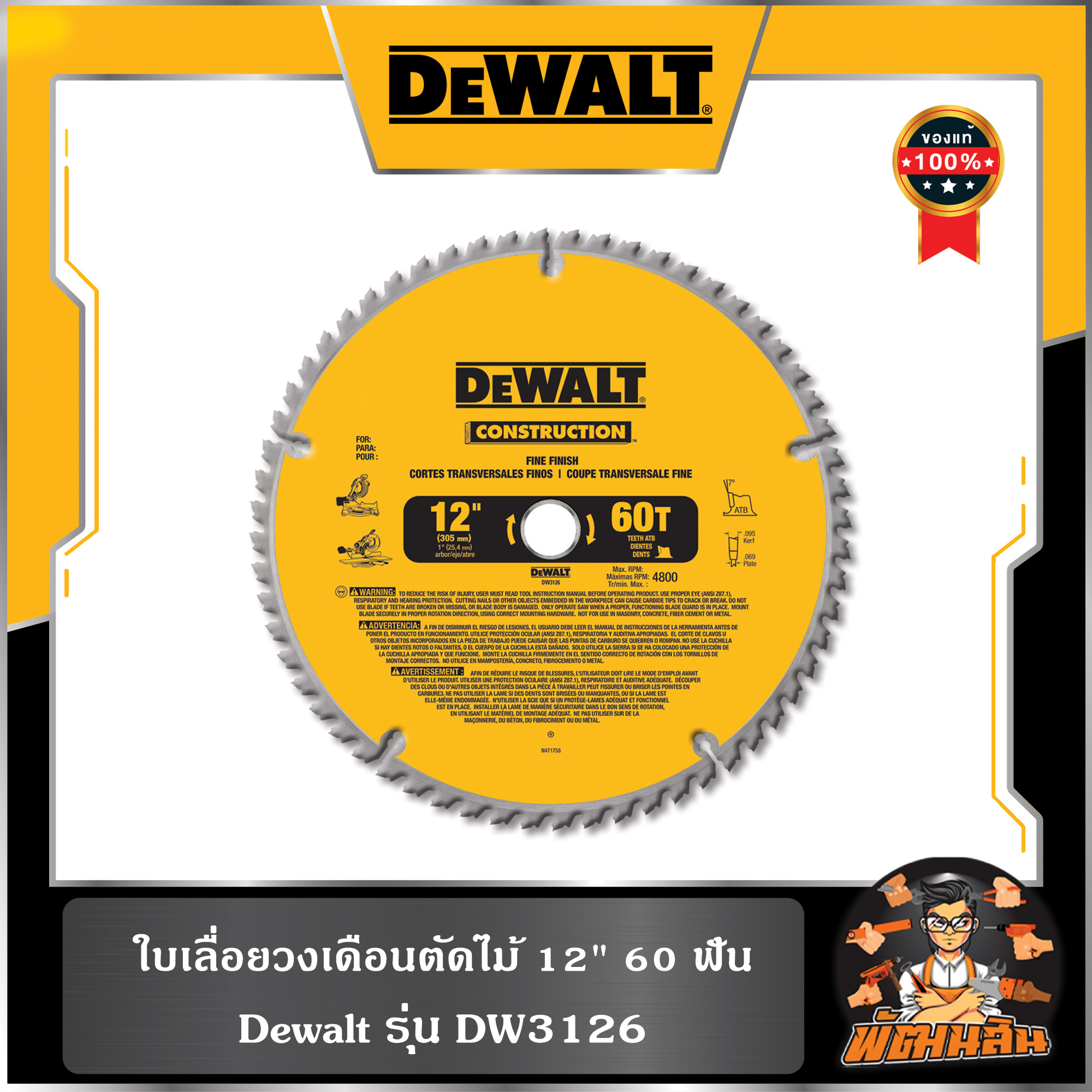 ใบเลื่อยวงเดือนตัดไม้ 12" 60 ฟัน Dewalt (DW3126)