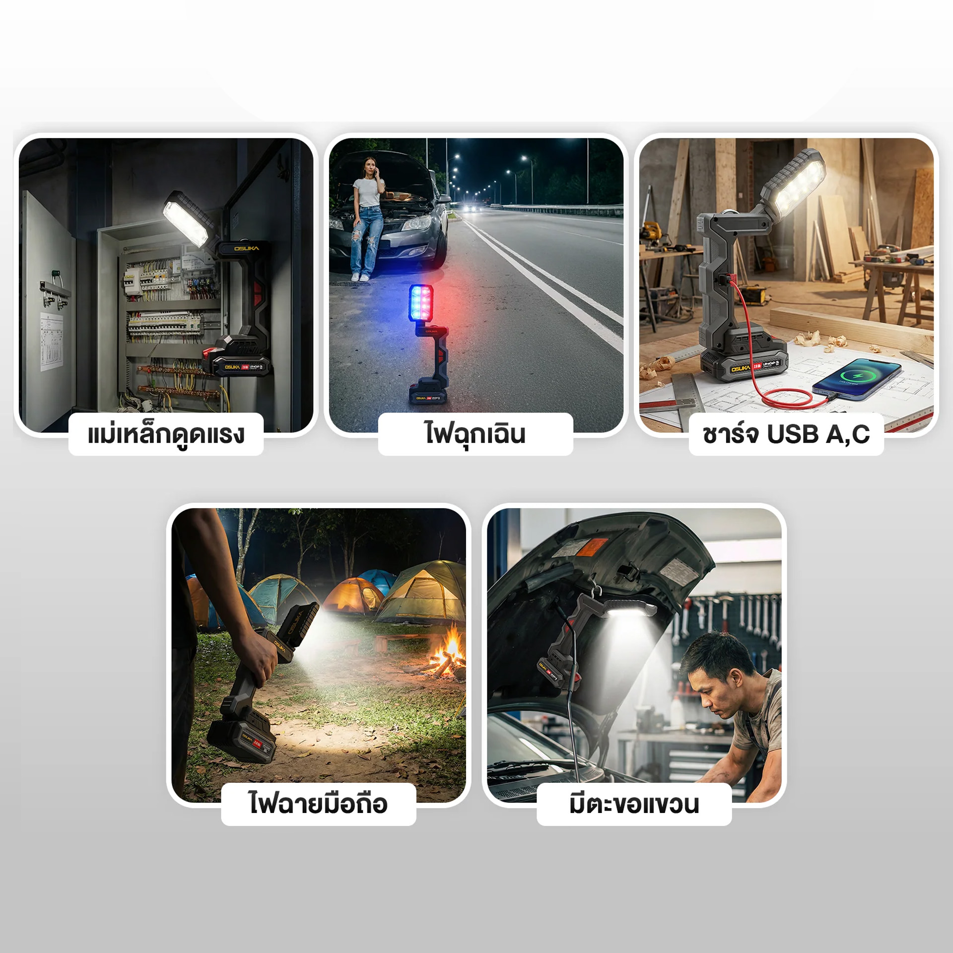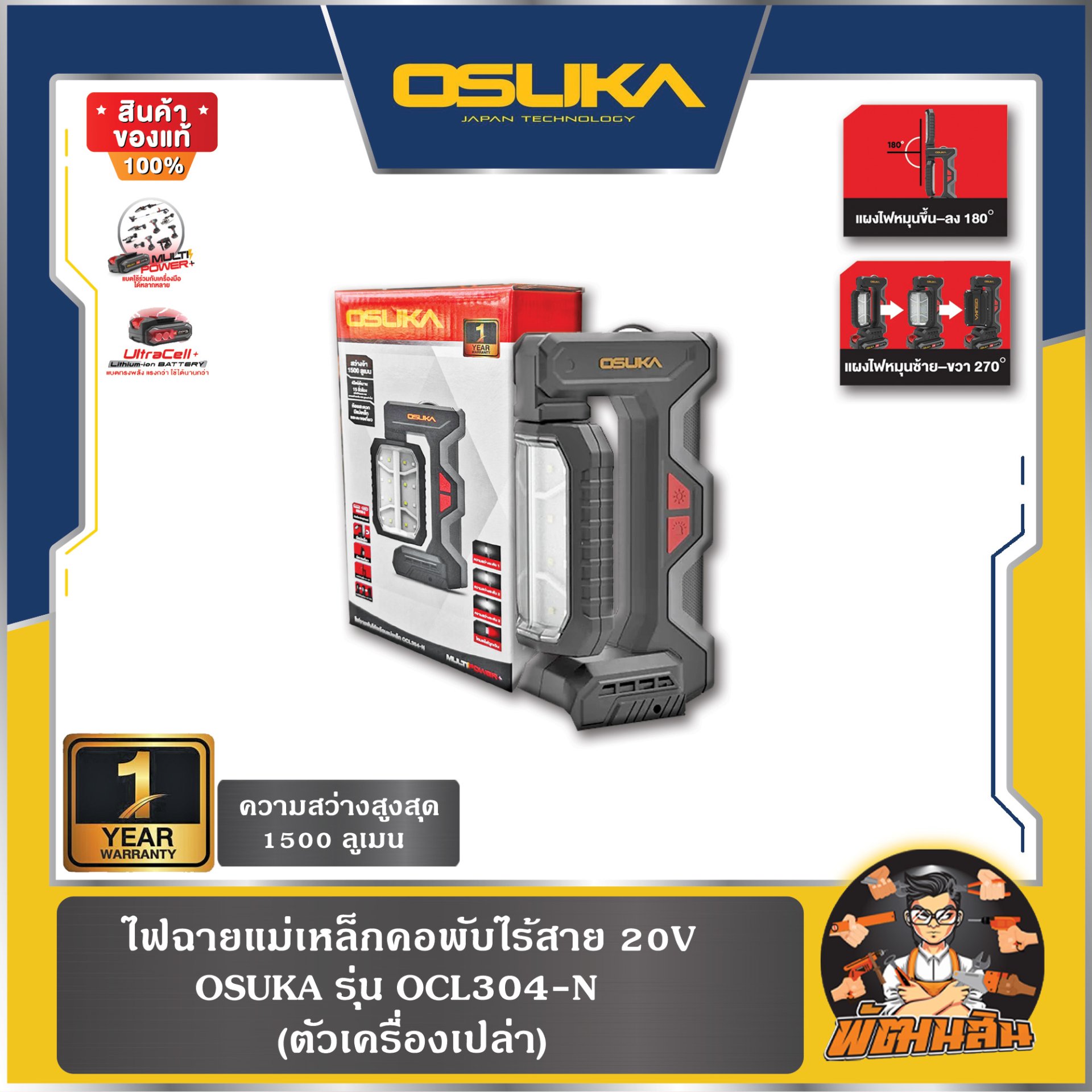 ไฟฉายแม่เหล็กคอพับไร้สาย 20V OCL304-D1 OSUKA (แบต 2.0Ah = 1 ก้อน) , ตัวเปล่า OCL304-N