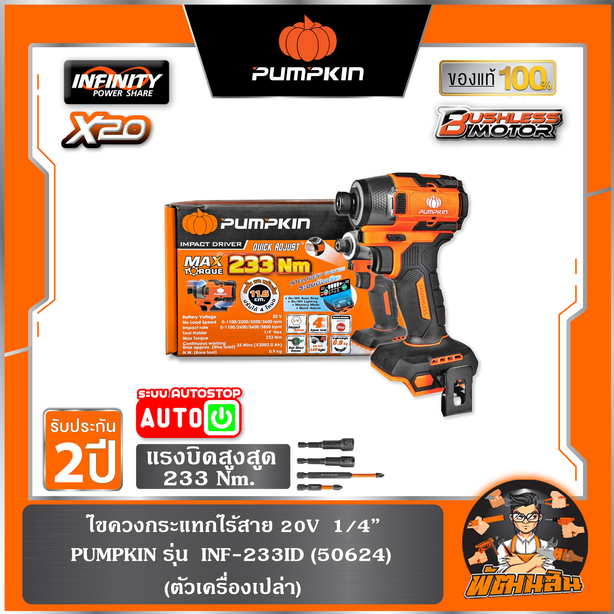 ไขควงกระแทกไร้สาย 20V 233N BL INF-233ID2 PUMPKIN (50625) แบต 2.0Ah x 1 ก้อน , ตัวเปล่า (50624)