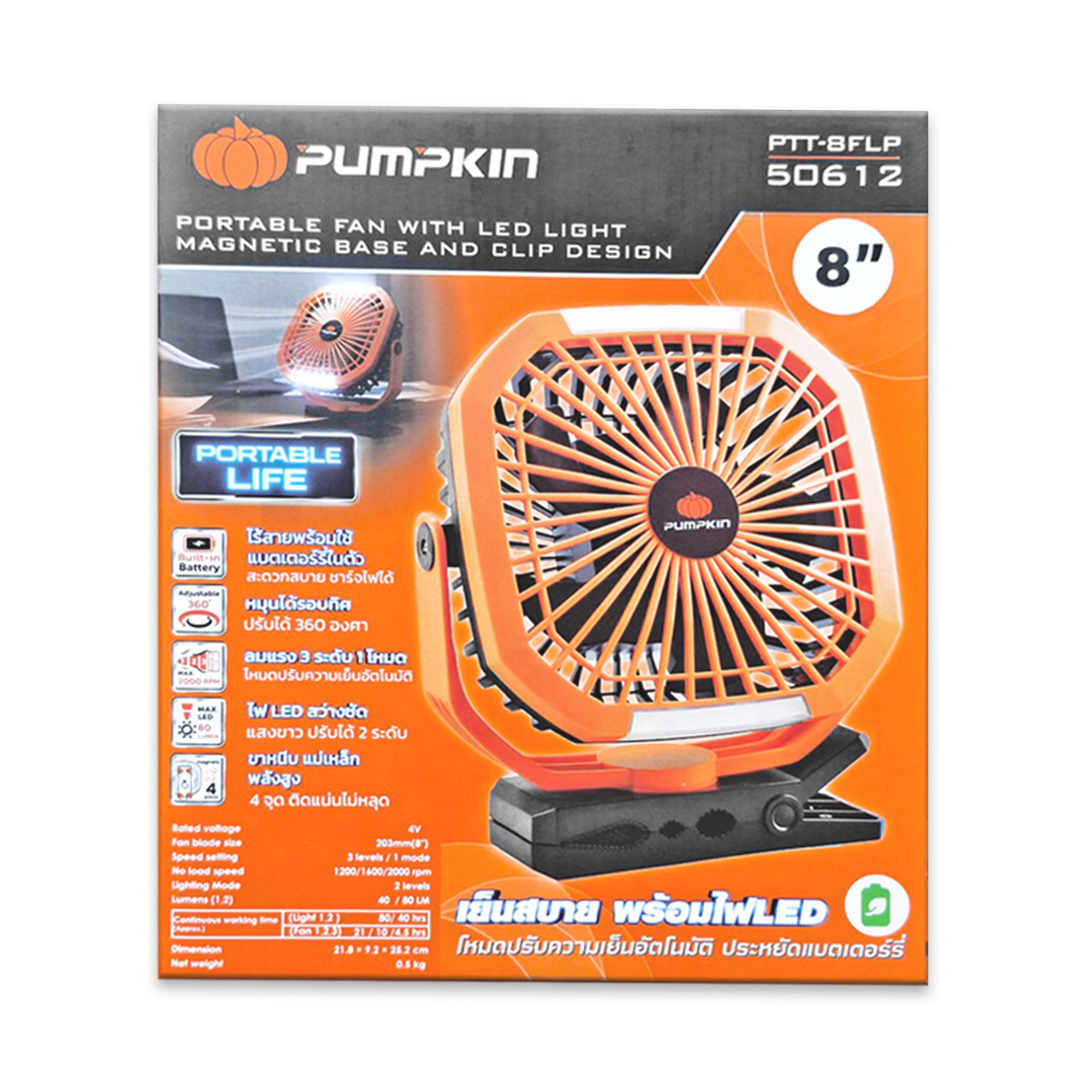 พัดลมพกพา 8" พร้อมไฟส่องสว่างพกพา ฐานแม่เหล็ก ขาหนีบได้ PTT-8FLP PUMPKIN (50612)